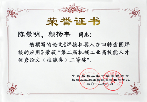 日前,由我司員工陳崇明、顏楊豐撰寫的論文《焊接機器人在回轉(zhuǎn)齒圈焊接的應(yīng)用》榮獲由中國機械工業(yè)企業(yè)管理協(xié)會、機械工業(yè)職業(yè)技能鑒定指導中心聯(lián)合舉辦的“第二屆機械工業(yè)高技能人才優(yōu)秀論文評選活動”技能類二等獎。