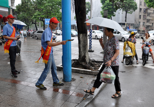 (圖a)志愿者深入到龍軸新村延安北路街頭,為過往行人分發安全生產宣傳資料