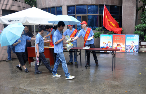 (圖b)志愿者在公司南大門,為公司員工分發安全生產宣傳資料。