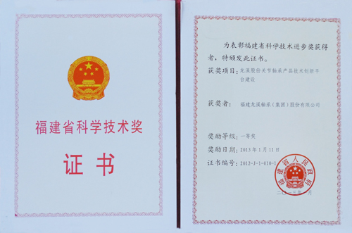 公司關(guān)節(jié)軸承產(chǎn)品技術(shù)創(chuàng)新平臺(tái)建設(shè)喜獲2012年度福建省科學(xué)技術(shù)進(jìn)步獎(jiǎng)一等獎(jiǎng)